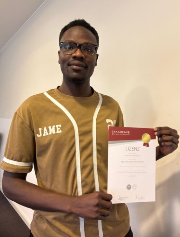 "Chris macht sich großartig. Er hat kürzlich die Fortbildung zum Medizinischen Fachtrainer absolviert und mir stolz sein Zertifikat präsentiert (s. Bild, Chris Jackson Ebole). Bei den Patienten kommt er super an. Es war die richtige Entscheidung, mit Ihnen zusammenzuarbeiten."